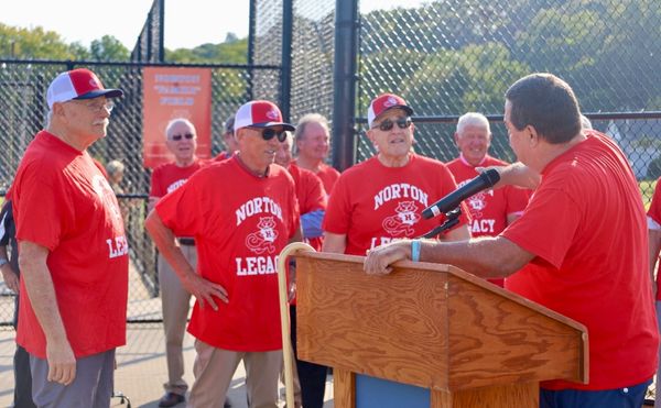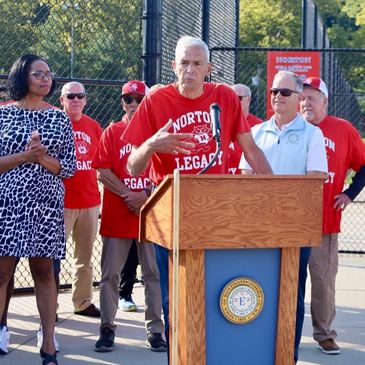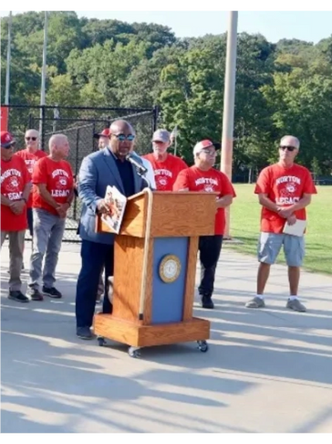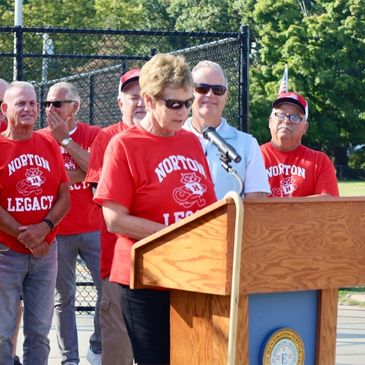 Jerry Asher, Tommy Forte, Gail Lambert, Leo Driscoll, (Jerry again) and Eddie Norton each take a turn at the podium to express our group's sincere appreciation of the resolution being passed and the honor of having the Mill Dam #2 field renamed.