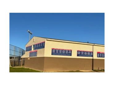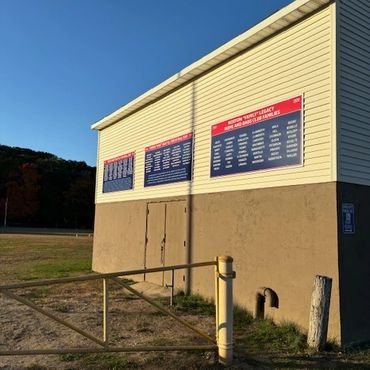 Official field dedication sign hung on first base dugout, facing toward behind the backstop area.