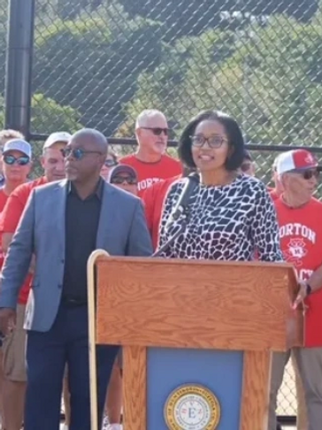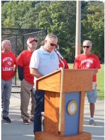 Huntington Township Supervisor Ed Smyth asks those in attendance how many went on to coach after their playing days during the dedication ceremony...At least 85% raised their hands.